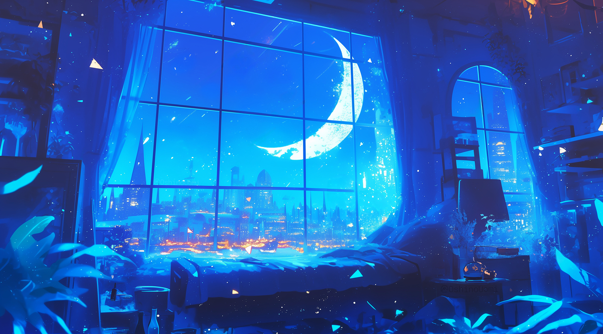 The familiar spaces of the bedroom were unrecognizable in the midnight dream of a world engulfed in deep shades of Cobalt Allure And Blue Mystery. Subtly drifting in the air, ethereal particles of light and energy vividly flicker along the tenuous boundary between the worlds of reality and dreams. Beyond the aperture and across the sky, the shimmering mirage of a crescent moon rises above the glimmering lights of a imaginary city. In the distance as countless miles of endless landscape begin to materialize into existence, the possibilities of this place and this moment become filled with limitless potential.