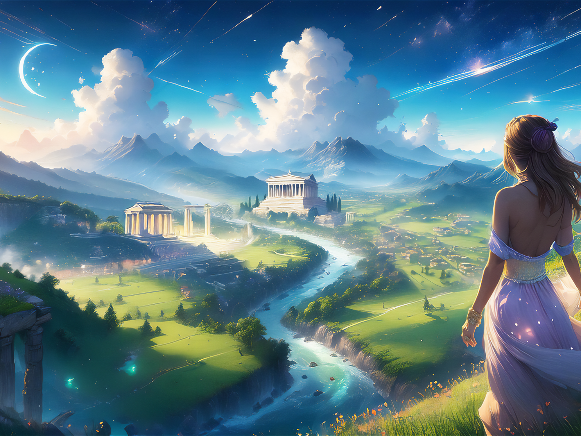 Falling stars streak across the twilight sky with comets and asteroids following in their wake. As the fading sun clashes with the rising moon, dreamy clouds roll across the endless horizon and far above the ancient ruins of the Viridescent Highlands.