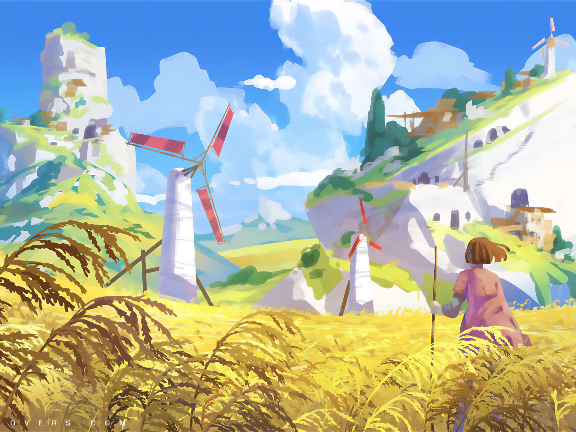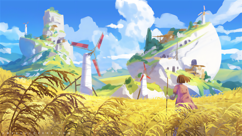 Dreamy, blue skies are lost in a hazy mirage of alabaster clouds far above the spaces of this serene scene. Across the land, stoic windmills spin in rhythmic circles as a fierce gale from the west blows over these Windswept Fields. Stretching beyond a vast distance, an ocean of golden wheat and chaff waves back and forth in unison. Step by step, the young girl makes her way back home among the cliffs and plateaus of her people.