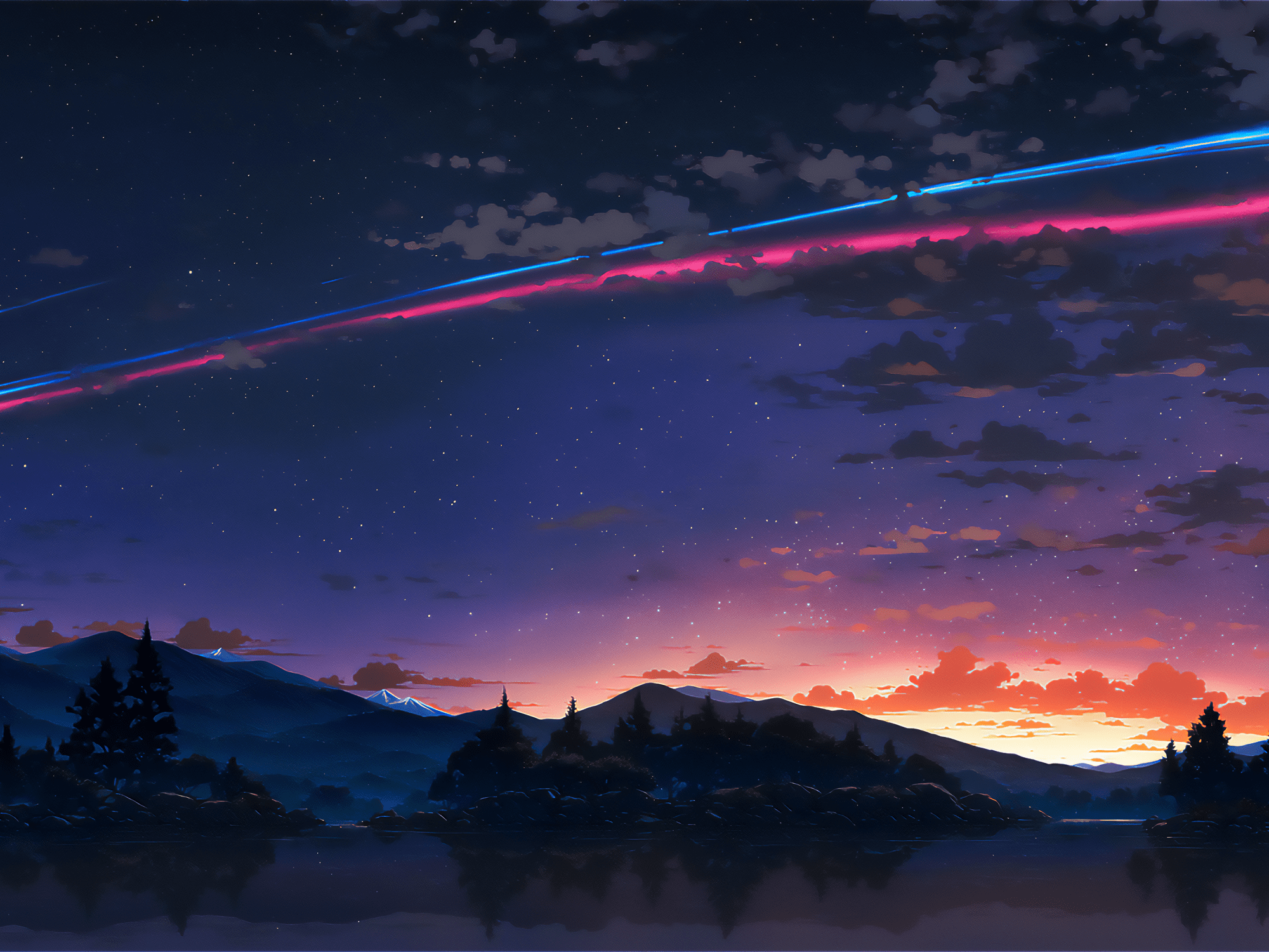 Twin comets set astray by fate and destiny soar across dusk-strewn skies in search of their Westward Wishes. Vibrant trails intertwined between shades of sapphire and scarlet are left in their wake as cosmic familiars travel alongside them. Soaring through wisps of fading clouds and further into the distant horizon, the landscape below is only a fleeting memory. As shadows stretch across the land filled with snow-capped mountain peaks, wooded forests and serene lakes, a vast canopy of stars fills the expanse of the night sky.